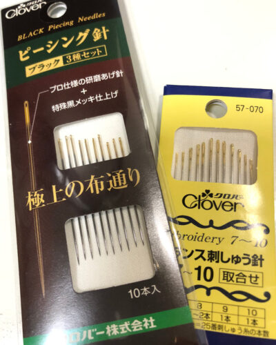 今回、活躍したピーシング針が大変素晴らしかったです。サクサクした布通りが気持ちいいです。厚めの箇所も縫いますので持っていると便利です。