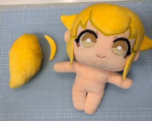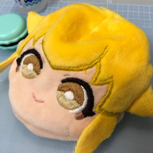 横のハネ毛にはワタを詰めています。4回位作り直しました…。小さいパーツなので難しい。その他、ポニーテールやアホ毛のキャラ独自のパーツに苦労しました。しかし、ここだけは自分でなんとかするしかない…!