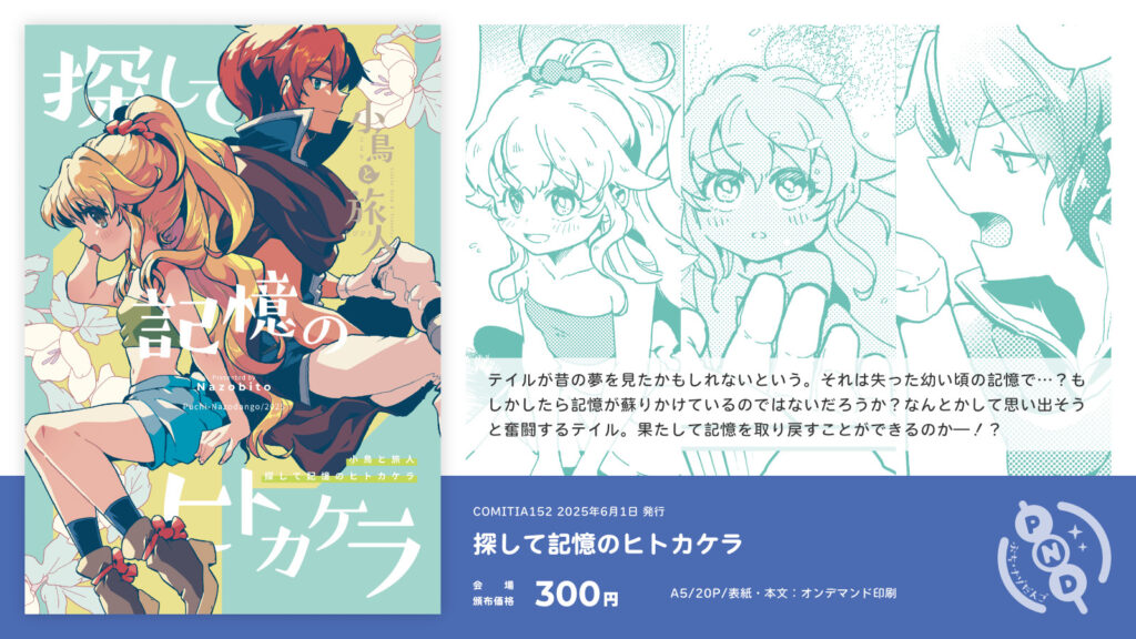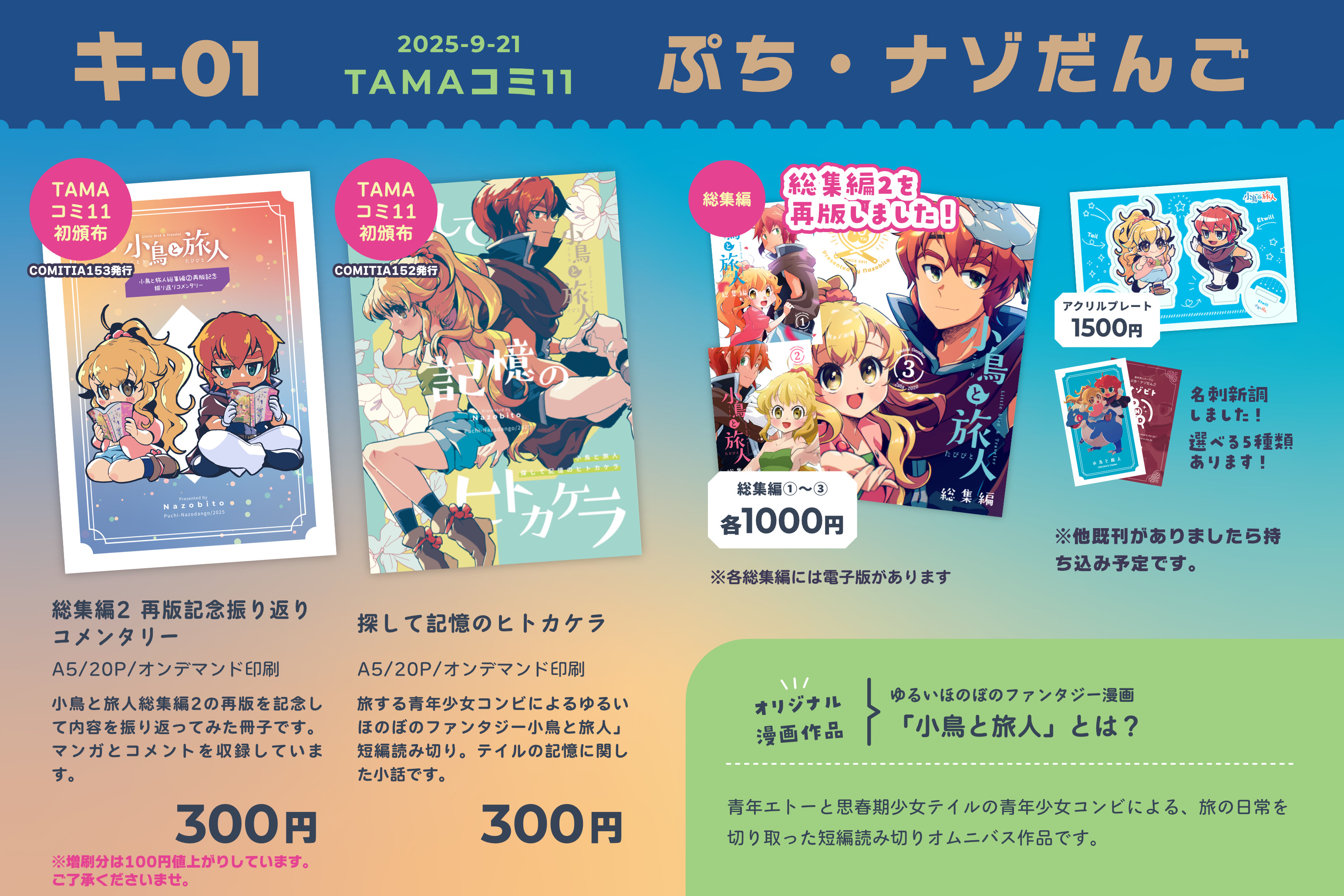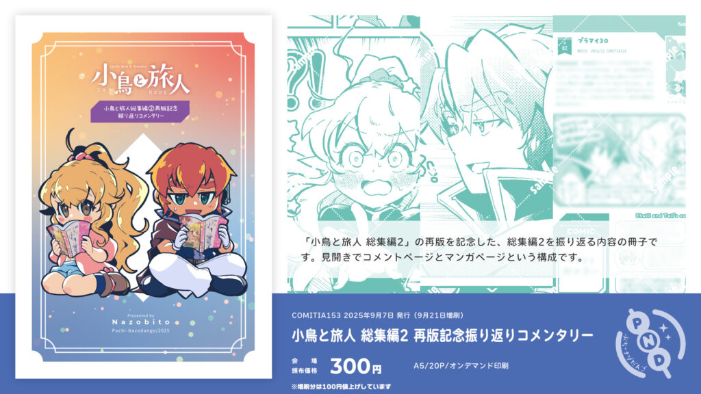今回のTAMAコミでは、COMITIA152・153の新刊を初頒布します。それら2冊の紹介画像を以下に掲載しています。COMITIA153新刊「小鳥と旅人総集編2 再版記念コメンタリー」の増刷分は仕様変更たのめ200円から300円へ値上がりしています。ご了承くださいませ。