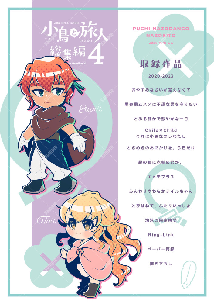 青年エトーと思春期少女テイルの旅の日常を切り取った短編読み切りオムニバスです。2020~2023年の作品と、ペーパー再録、描き下ろしページを収録しています。おまけでしおりが付きます。