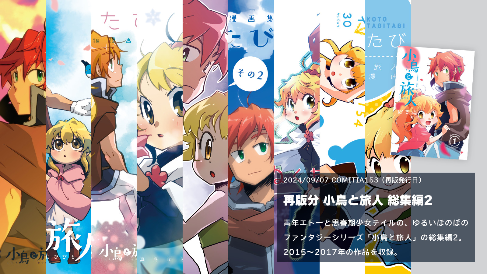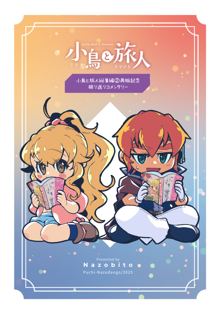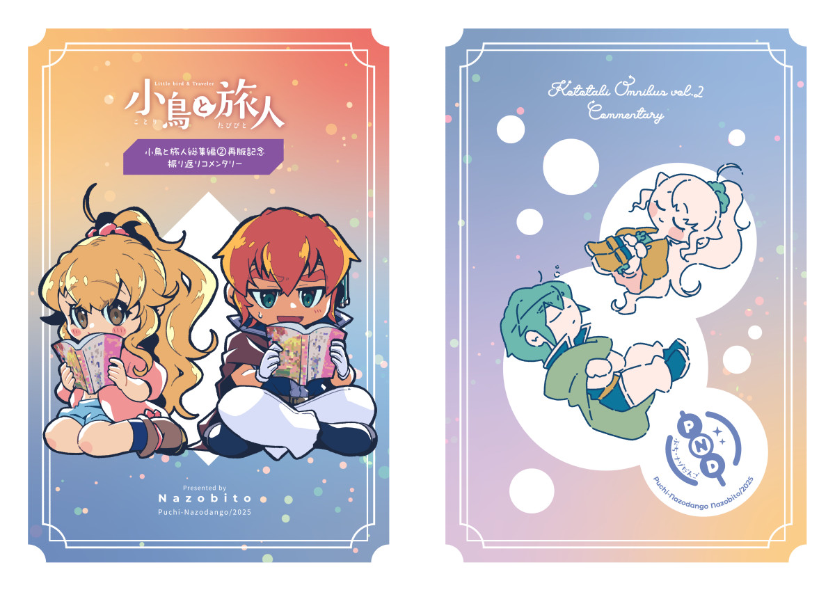 同人誌紹介-2025年発行分小鳥と旅人 おでかけしないと、ほどけません仕様A5/オンデマンド印刷/表紙込み20ページ2025/11/24(COMITIA154)発行あらすじエトーとおでかけをする事になったテイル。街を見て回ったり買い物をしたり食事をしたり…。それはテイルにとって憧れごとのひとつ。しかしそれは、とある呪いから解放されるために必要なようで…?楽しいのか危険なのか分からない、特別なおでかけ―”デート”を完遂することができるのか!?コメントおでかけ回リベンジです。今後もおでかけシリーズとして展開できたらいいなあ。コミカルでかわいいはことたびの原点(?)ですからね。展開が進む系の話もいいですが、こういう話も大事。関連記事北海道COMITIA22&COMITIA154ありがとうございました!2025.12.07作品サンプル小鳥と旅人 総集編2 再版記念振り返りコメンタリー仕様A5/オンデマンド印刷/表紙込み20ページ2025/09/07(COMITIA153)発行あらすじ「小鳥と旅人 総集編2」の再版を記念した、総集編2を振り返る内容の冊子です。見開きでコメントページとマンガページという構成です。コメント総集編1コメンタリーより、読み物として少しでも楽しめるようにしたいとコメントページをリニューアルしました。このコメンタリー本は自分でも楽しい本にしていきたいですね。関連記事COMITIA153&TAMAコミ11ありがとうございました!2025.09.27作品サンプル小鳥と旅人 総集編2【再版】仕様A5/オンデマンド印刷/表紙込み174ページ2025/09/07(COMITIA153)発行あらすじ小鳥と旅人の総集編2冊目の再版分。表紙タイトルや背表紙デザインなどの変更・誤字などの修正。再版用のあとがき・新規カットの追加有り。※追加ページを以下に掲載いたします。初版を手にとってくださった皆様に感謝御礼申し上げます。関連記事【A52a】COMITIA153おしらせ2025.07.27関連記事COMITIA153&TAMAコミ11ありがとうございました!2025.09.27作品サンプル小鳥と旅人 探して記憶のヒトカケラ仕様A5/オンデマンド印刷/表紙込み20ページ2025/06/01(COMITIA152)発行あらすじテイルが昔の夢を見たかもしれないという。それは失った幼い頃の記憶で…?エトーと出会う以前の記憶を持たないテイル。彼女にとってそれは自身のことを知る手がかりになるかもしれない。もしかしたら記憶が蘇りかけているのではないだろうか?なんとかして思い出そうと奮闘するテイル。果たして記憶を取り戻すことができるのか―!?コメントテイルの過去についてのお話です。最近ようやくこのネタに触れるようになりました…!この辺りは今後も展開していきたいと思っています。関連記事COMITIA152ありがとうございました!2025.06.21作品サンプル小鳥と旅人 短夜の終わる頃に仕様A5/表紙孔版印刷・本文オンデマンド印刷/表紙込み20ページ2025/02/16(COMITIA151)発行あらすじ二人は昼間でも真っ暗闇に包まれる怪しげな森に行って、怖くて嬉しくてどきどき。夏の夜祭で楽しんだり、懐かしさに思いを馳せたり…?そんな短編を2話収録。コメントま~~たエトーに匂わせネタ仕込んでる。この辺もどこかで描きたいと思っています。関連記事【R20b】COMITIA151おしらせ2024.12.03作品サンプル年別同人誌紹介ページ一覧同人誌紹介-2025年発行分同人誌紹介-2024年発行分同人誌紹介-2023年発行分同人誌紹介-2022年発行分同人誌紹介-2021年発行分同人誌紹介-2020年発行分同人誌紹介-2019年発行分同人誌紹介-2018年発行分同人誌紹介-2017年発行分同人誌紹介-2016年発行分同人誌紹介-2015年発行分同人誌紹介-2013-2014年発行分同人誌紹介-2012年発行分同人誌紹介-2010-2011年発行分