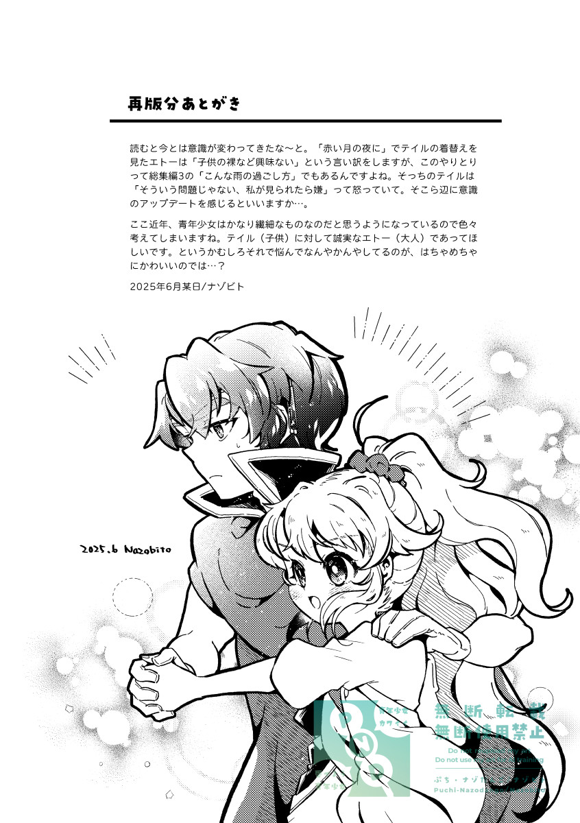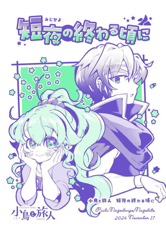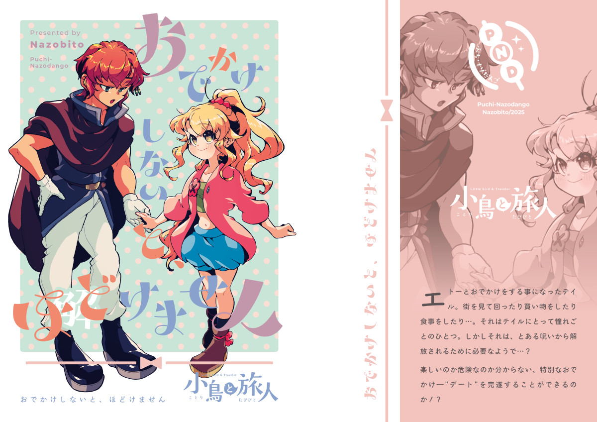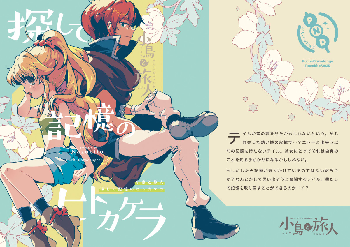 同人誌紹介-2025年発行分小鳥と旅人 おでかけしないと、ほどけません仕様A5/オンデマンド印刷/表紙込み20ページ2025/11/24(COMITIA154)発行あらすじエトーとおでかけをする事になったテイル。街を見て回ったり買い物をしたり食事をしたり…。それはテイルにとって憧れごとのひとつ。しかしそれは、とある呪いから解放されるために必要なようで…?楽しいのか危険なのか分からない、特別なおでかけ―”デート”を完遂することができるのか!?コメントおでかけ回リベンジです。今後もおでかけシリーズとして展開できたらいいなあ。コミカルでかわいいはことたびの原点(?)ですからね。展開が進む系の話もいいですが、こういう話も大事。関連記事北海道COMITIA22&COMITIA154ありがとうございました!2025.12.07作品サンプル小鳥と旅人 総集編2 再版記念振り返りコメンタリー仕様A5/オンデマンド印刷/表紙込み20ページ2025/09/07(COMITIA153)発行あらすじ「小鳥と旅人 総集編2」の再版を記念した、総集編2を振り返る内容の冊子です。見開きでコメントページとマンガページという構成です。コメント総集編1コメンタリーより、読み物として少しでも楽しめるようにしたいとコメントページをリニューアルしました。このコメンタリー本は自分でも楽しい本にしていきたいですね。関連記事COMITIA153&TAMAコミ11ありがとうございました!2025.09.27作品サンプル小鳥と旅人 総集編2【再版】仕様A5/オンデマンド印刷/表紙込み174ページ2025/09/07(COMITIA153)発行あらすじ小鳥と旅人の総集編2冊目の再版分。表紙タイトルや背表紙デザインなどの変更・誤字などの修正。再版用のあとがき・新規カットの追加有り。※追加ページを以下に掲載いたします。初版を手にとってくださった皆様に感謝御礼申し上げます。関連記事【A52a】COMITIA153おしらせ2025.07.27関連記事COMITIA153&TAMAコミ11ありがとうございました!2025.09.27作品サンプル小鳥と旅人 探して記憶のヒトカケラ仕様A5/オンデマンド印刷/表紙込み20ページ2025/06/01(COMITIA152)発行あらすじテイルが昔の夢を見たかもしれないという。それは失った幼い頃の記憶で…?エトーと出会う以前の記憶を持たないテイル。彼女にとってそれは自身のことを知る手がかりになるかもしれない。もしかしたら記憶が蘇りかけているのではないだろうか?なんとかして思い出そうと奮闘するテイル。果たして記憶を取り戻すことができるのか―!?コメントテイルの過去についてのお話です。最近ようやくこのネタに触れるようになりました…!この辺りは今後も展開していきたいと思っています。関連記事COMITIA152ありがとうございました!2025.06.21作品サンプル小鳥と旅人 短夜の終わる頃に仕様A5/表紙孔版印刷・本文オンデマンド印刷/表紙込み20ページ2025/02/16(COMITIA151)発行あらすじ二人は昼間でも真っ暗闇に包まれる怪しげな森に行って、怖くて嬉しくてどきどき。夏の夜祭で楽しんだり、懐かしさに思いを馳せたり…?そんな短編を2話収録。コメントま~~たエトーに匂わせネタ仕込んでる。この辺もどこかで描きたいと思っています。関連記事【R20b】COMITIA151おしらせ2024.12.03作品サンプル年別同人誌紹介ページ一覧同人誌紹介-2025年発行分同人誌紹介-2024年発行分同人誌紹介-2023年発行分同人誌紹介-2022年発行分同人誌紹介-2021年発行分同人誌紹介-2020年発行分同人誌紹介-2019年発行分同人誌紹介-2018年発行分同人誌紹介-2017年発行分同人誌紹介-2016年発行分同人誌紹介-2015年発行分同人誌紹介-2013-2014年発行分同人誌紹介-2012年発行分同人誌紹介-2010-2011年発行分